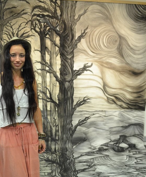 Elle présentait une œuvre de 2 m 50 de large sur 5 m de haut, peinte à la mine graphite, à l’encre de chine et à la craie « dans ma cuisine », précise l’artiste. Elle songe à agrandir la toile, la prolonger d’autres éléments qui viendraient compléter le message qui est la dénonciation de la déforestation.