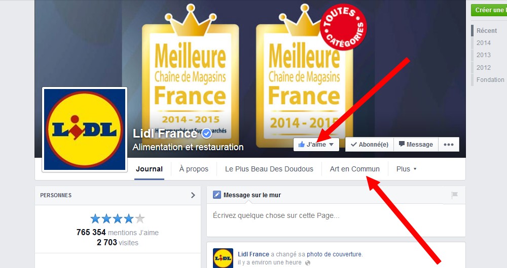 Cliquez sur l’onglet «J’aime » présent en haut de la page Facebook de Lidl France si vous n'êtes pas encore fan puis :