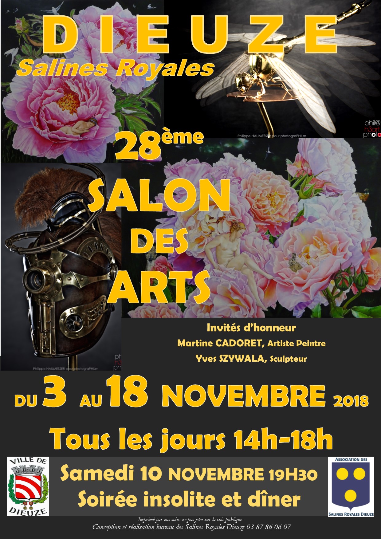 Chaque année deux artistes de renom sont invités d'honneur. Cette année, c'est moi, Martine Cadoret qui a été choisie pour parrainer la manifestation.avec mon ami sculpteur Yves Szywala. Ce 28e salon des Arts se déroulera du 3 au 18 novembre 2018, dans le superbe écrin de la Délivrance,à Dieuze et présentera 75 artistes et près de 250 œuvres.