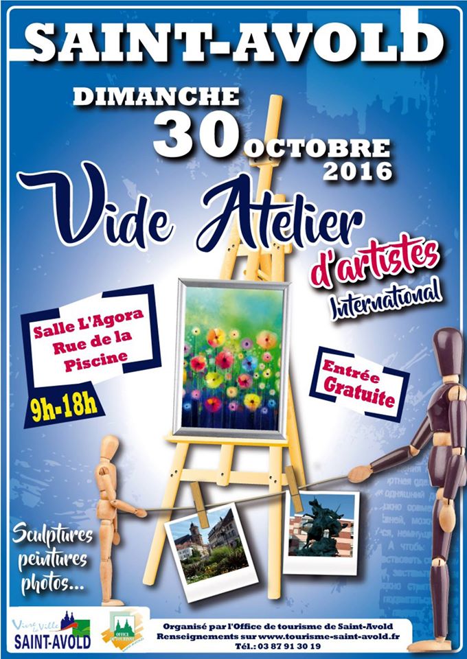 Je participe pour la première fois, le 30 octobre 2016, à un vide atelier d’artistes international organisé par l’Office de tourisme de Saint Avold de 09h à 18h à la salle Agora, et serais heureuse de vous rencontrer, pour discuter peinture et pour vous proposer... de libérer mes murs.